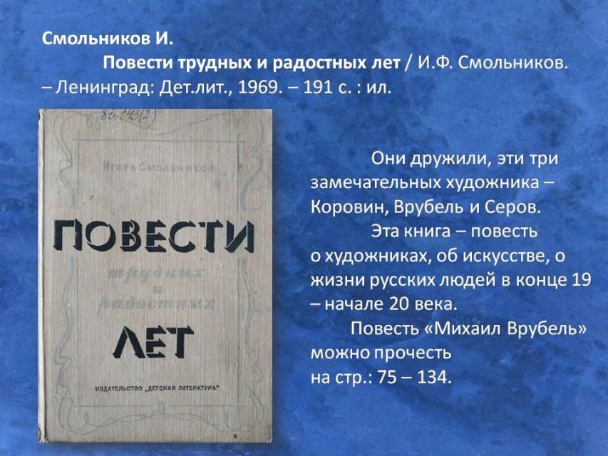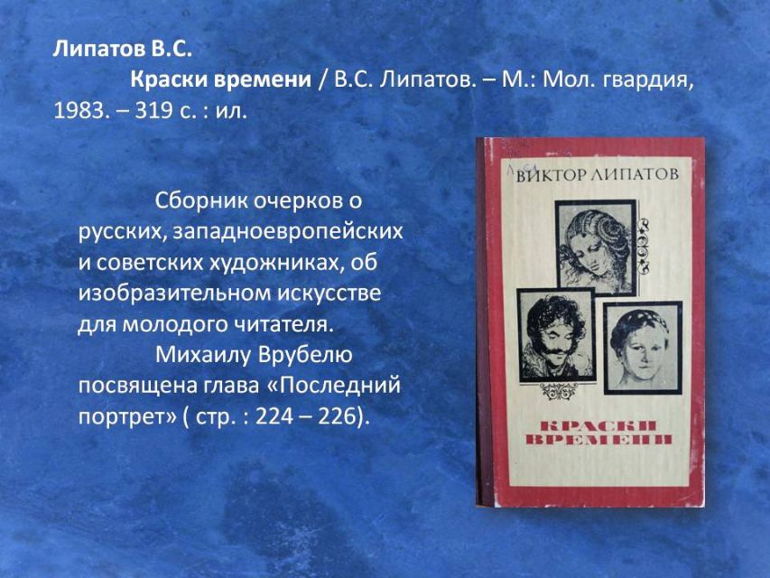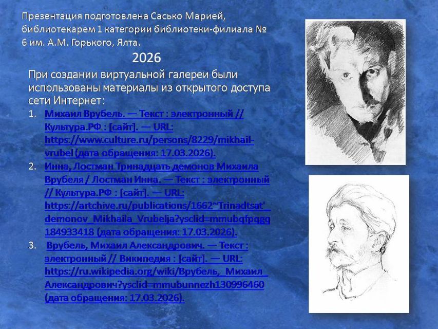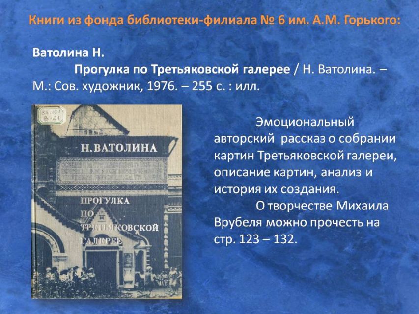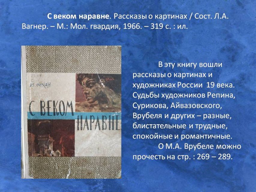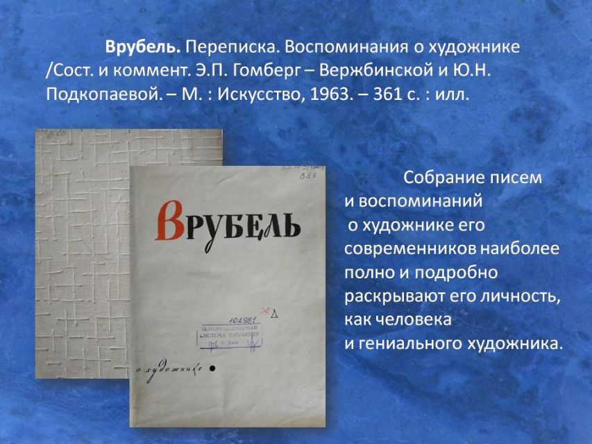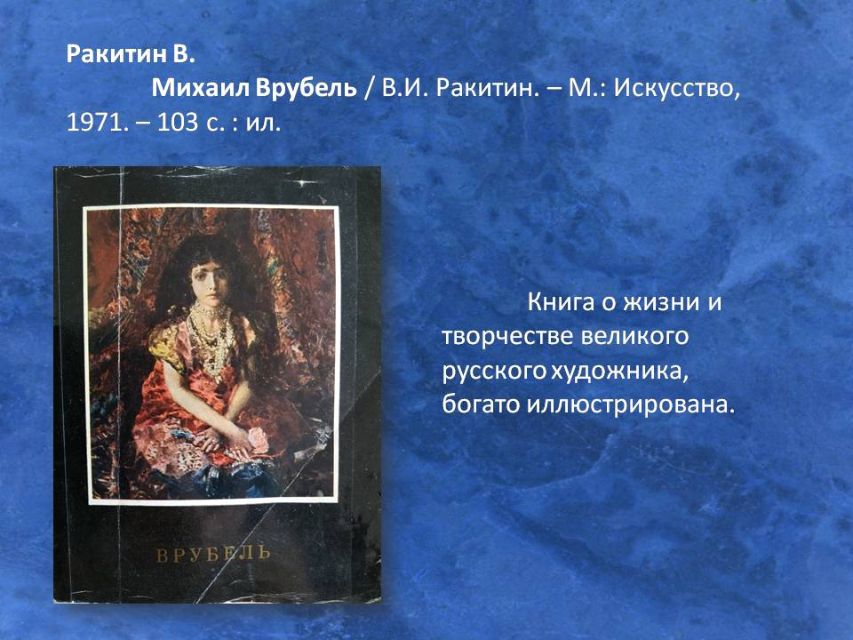 17 марта исполняется 170 лет со дня рождения великого русского художника Михаила Врубеля. К этому дню библиотека-филиал № 6 имени А.М.Горького подготовила виртуальный обзор литературы "Сумрачный гений", где представлены книги о художнике и его картинах.