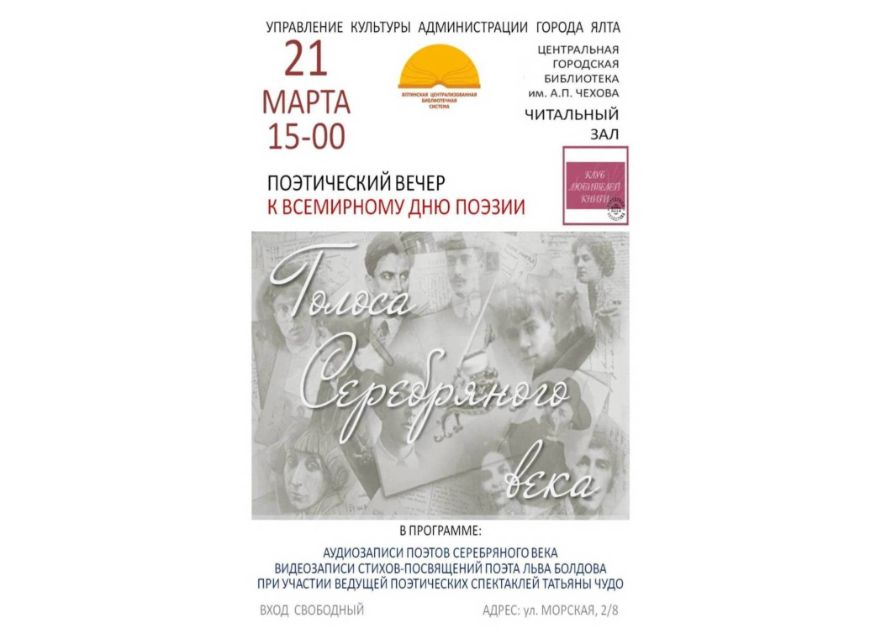 К Всемирному дню поэзии 21 марта в 15:00 в читальном зале Центральной городской библиотеки имени А.П. Чехова состоится поэтический вечер "Голоса Серебряного века" с участием ведущей поэтических спектаклей Татьяной Чудо (Екатеринбург - Гурзуф). Отдел редкой книги представит книжную выставку с прижизненными публикациями поэтов Серебряного века.