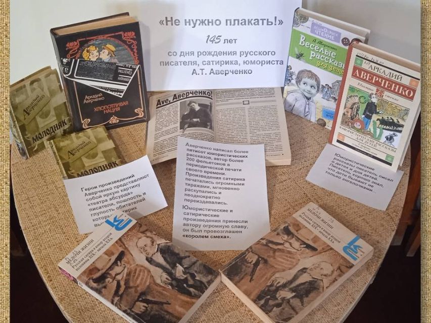 К 145-летию со дня рождения Аркадия Аверченко, русского писателя, сатирика, юмориста, театрального критика, библиотека-филиал № 23 имени С.В.Руданского провела с читателями беседу у книжной полки "Не нужно плакать". Здесь представлены также юмористические рассказы писателя, написанные о детях и для детей. Писатель-сатирик хорошо знал, что дети бывают не только ангелочками...