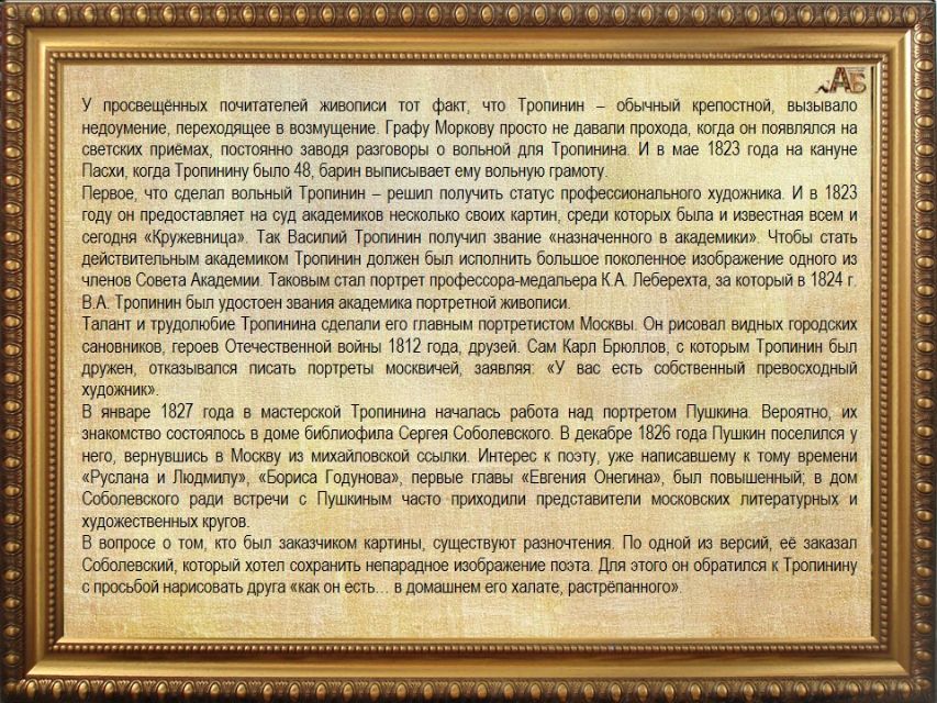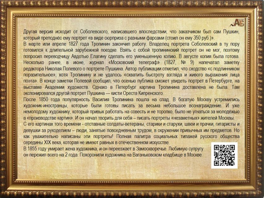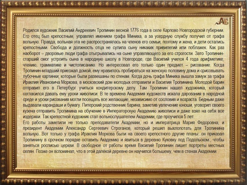 В.А. Тропинин - не просто художник, а летописец русской души, чьи работы навсегда останутся в сокровищнице мирового искусства. Его портреты украшают лучшие музеи страны, их изучают искусствоведы, ими восхищаются миллионы людей.