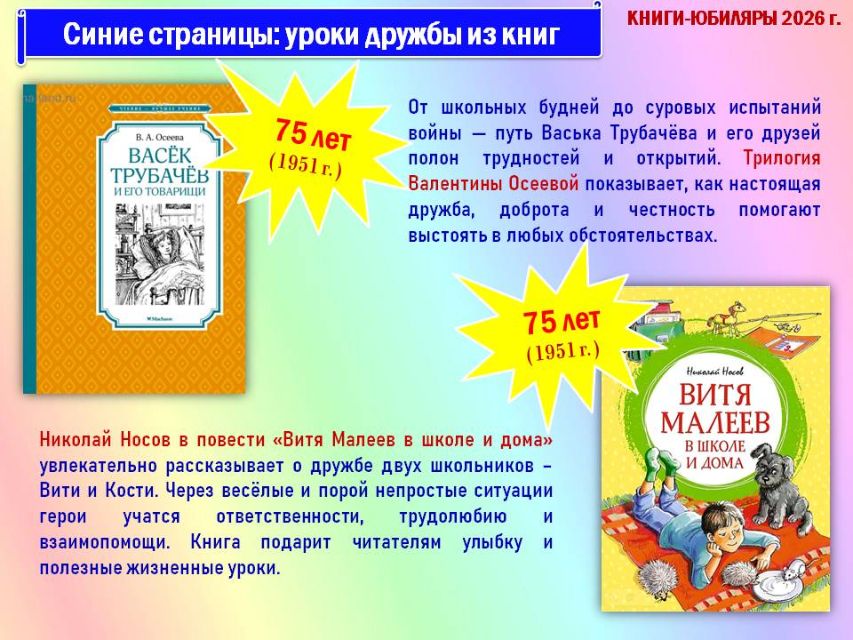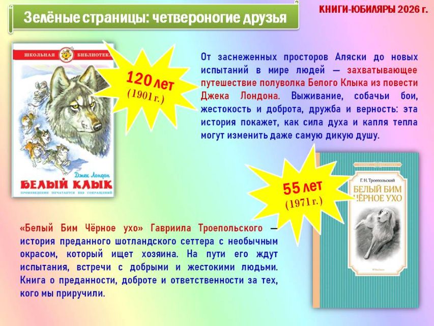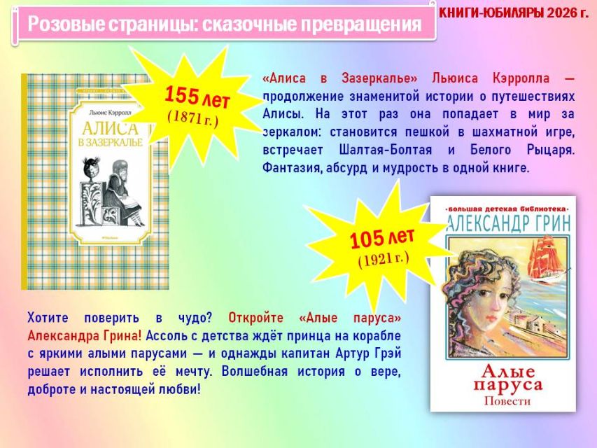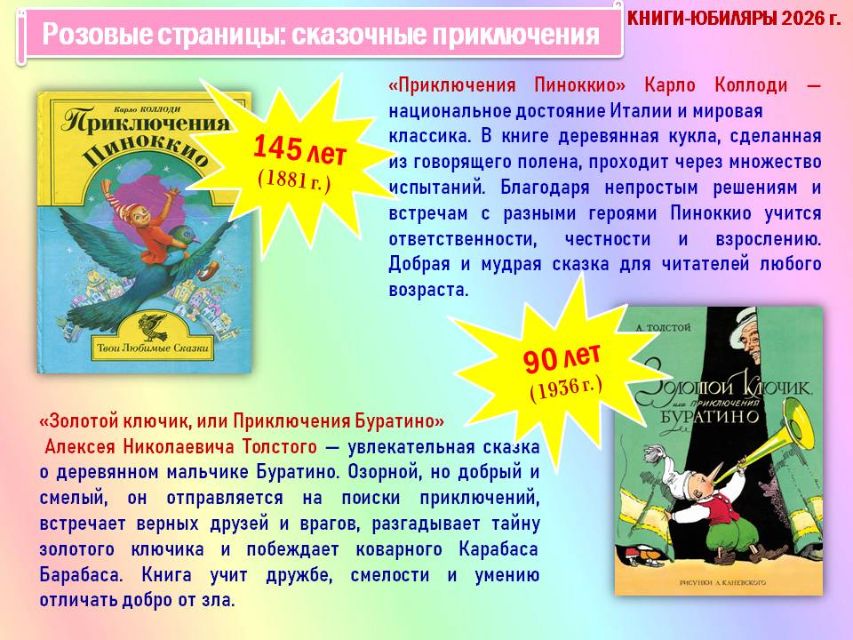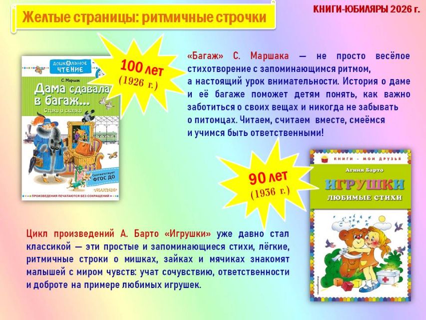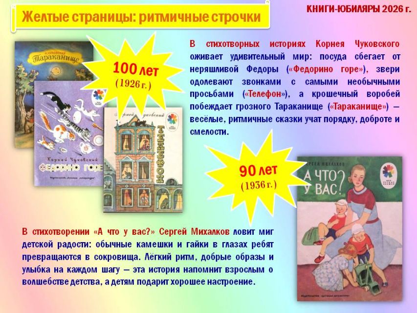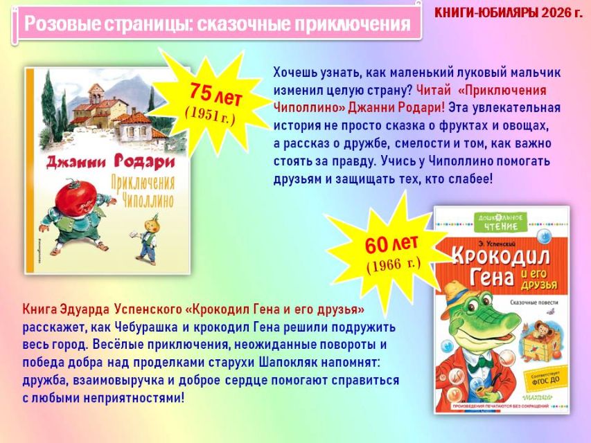Обзор начинается с краткой истории о Международном дне детской книги и продолжается путешествием по красочным разделам книг-юбиляров «Жёлтые страницы: ритмичные строчки», «Розовые страницы: сказочные превращения», «Красные страницы: школьная классика», «Голубые страницы: приключений и открытий», «Синие страницы: доброты и дружбы», «Зелёные страницы: четвероногие друзья».