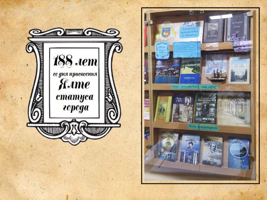 Уникальному историческому пути Ялты посвящена книжная выставка "Ялтинские путешествия по времени" в абонементном отделе Центральной городской библиотеки имени А.П. Чехова. Представленные на выставке книги рассказывают об истории города и известных людях, вдохновлённых его красотой, которые здесь жили и работали: писатели А. Чехов, Л. Толстой, М. Горький, А. Куприн, архитектор Н. Краснов.
