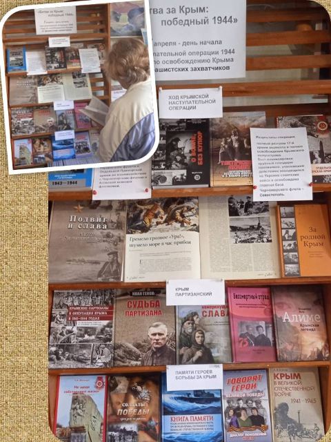 На выставке представлены новые художественно-документальные издания о ходе Крымской наступательной операции: Д. Дёгтев «Воздушная битва за Крым 1943-1944» (Москва, 2022 г.), сборник научных статей и материалов, отражающих события в Керчи и на Керченском полуострове в годы Великой Отечественной войны «О войне без купюр» (Симферополь, 2024 г.), научное издание «Подвиг и слава. Керчь и Керченский полуостров» (Симферополь, 2020 г.) и др.