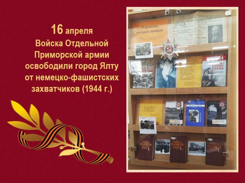 16 апреля - дата, навсегда вписанная в историю Ялты. В этот день в 1944 году после долгих и кровопролитных боёв советские войска освободили жемчужину Крыма от фашистской оккупации. К этому знаменательному событию абонементный отдел Центральной городской библиотеки имени А.П. Чехова подготовил беседу у книжной выставки "И мужество, как знамя, пронесли".