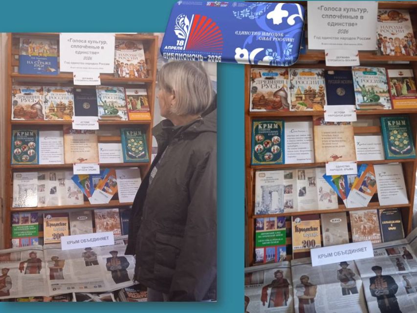 В рамках Всероссийской акции "Библионочь-2026" в Год единства народов России в библиотеке-филиале № 23 имени С.В. Руданского оформлена книжно-иллюстративная выставка "Голоса культур, сплочённые в единстве", где представлены книжные издания по истории нашей великой державы, а также книги, посвящённые единству народов Крыма.