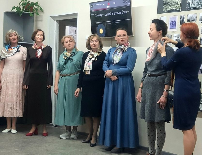 Светлана Молодец, много лет проработавшая художником-гримером на ялтинской киностудии, рассказала об истории платка, который неизменно присутствует в костюмах разных народов, во время фольклорного дефиле читательниц библиотеки. Затаив дыхание, присутствующие наблюдали, как дизайнер, декоратор, руководитель творческой швейной мастерской в Алупке Алина Кузнецова виртуозно, с помощью разнообразных способов завязывания платков, превращает современные платья в изысканные наряды.