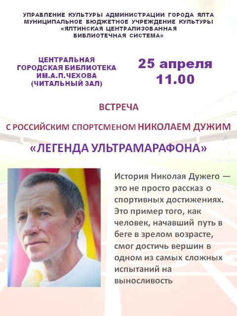 25 апреля в 11:00 в читальном зале Центральной городской библиотеки имени А.П. Чехова состоится встреча "Легенда ультрамарафона" с Николаем Дужим, самым известным российским спортсменом в мире бега на сверхдлинные дистанции. На встрече спортсмен расскажет историю о своём пути в спорте, как начав путь в беге в зрелом возрасте, он смог достичь вершин в одном из самых сложных испытаний на выносливость.